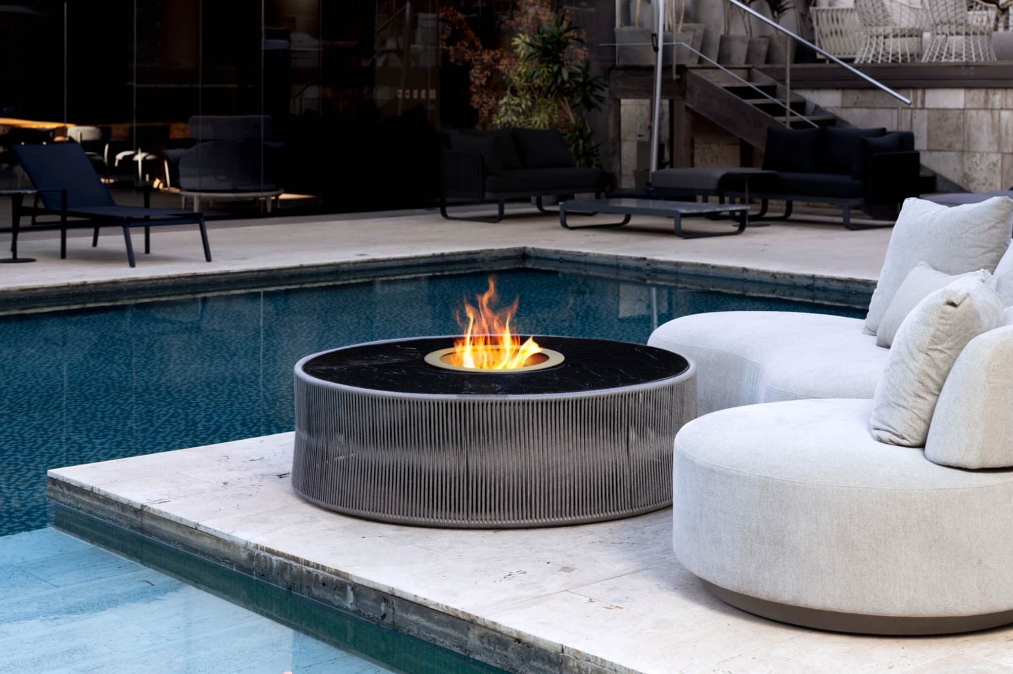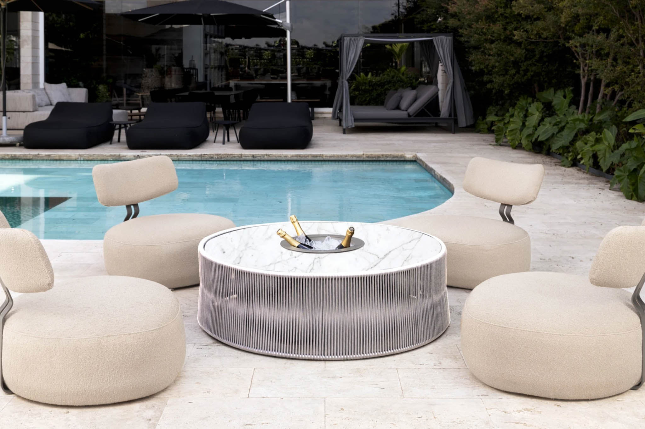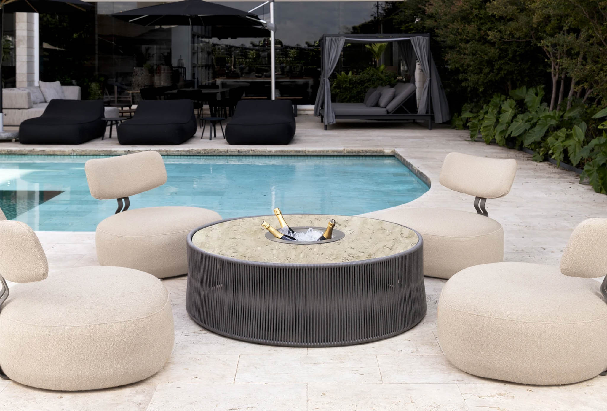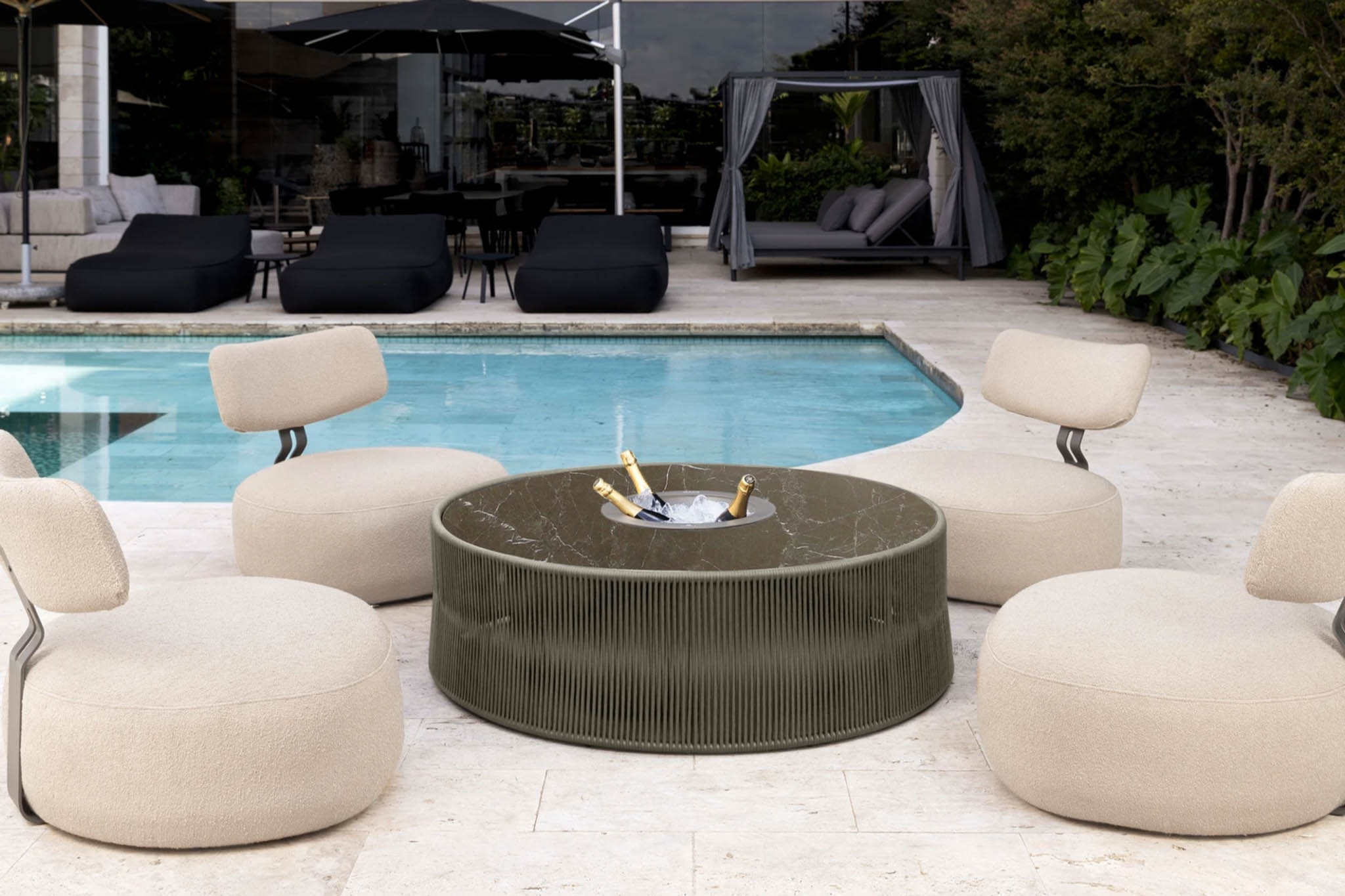 In keeping with Magna’s custom DNA, the Oasis offers a range of 10 natural stone options (including marble, quartzite, and granite) and five woven rope choices, providing an extensive array of finishes to harmonize with any decor. When using the central ice bucket, select from a palette of nine color options.