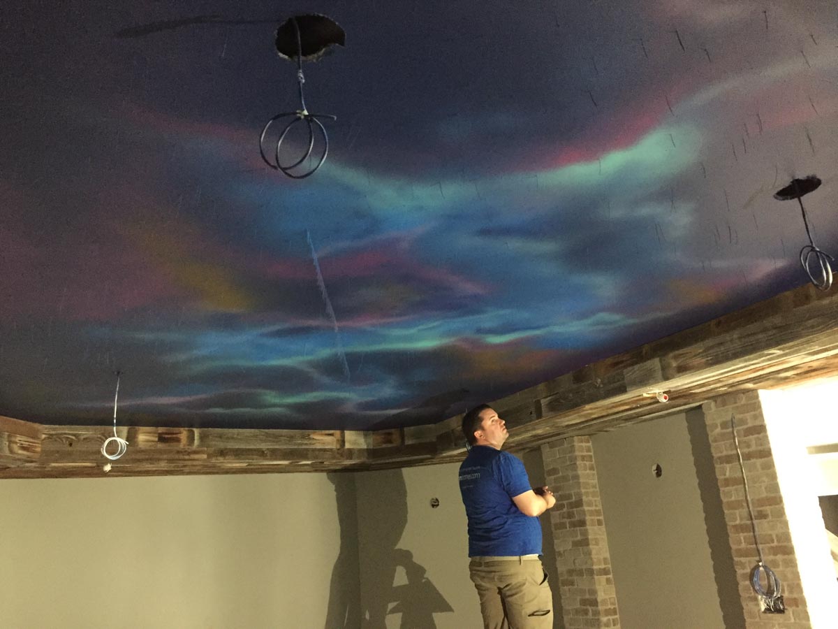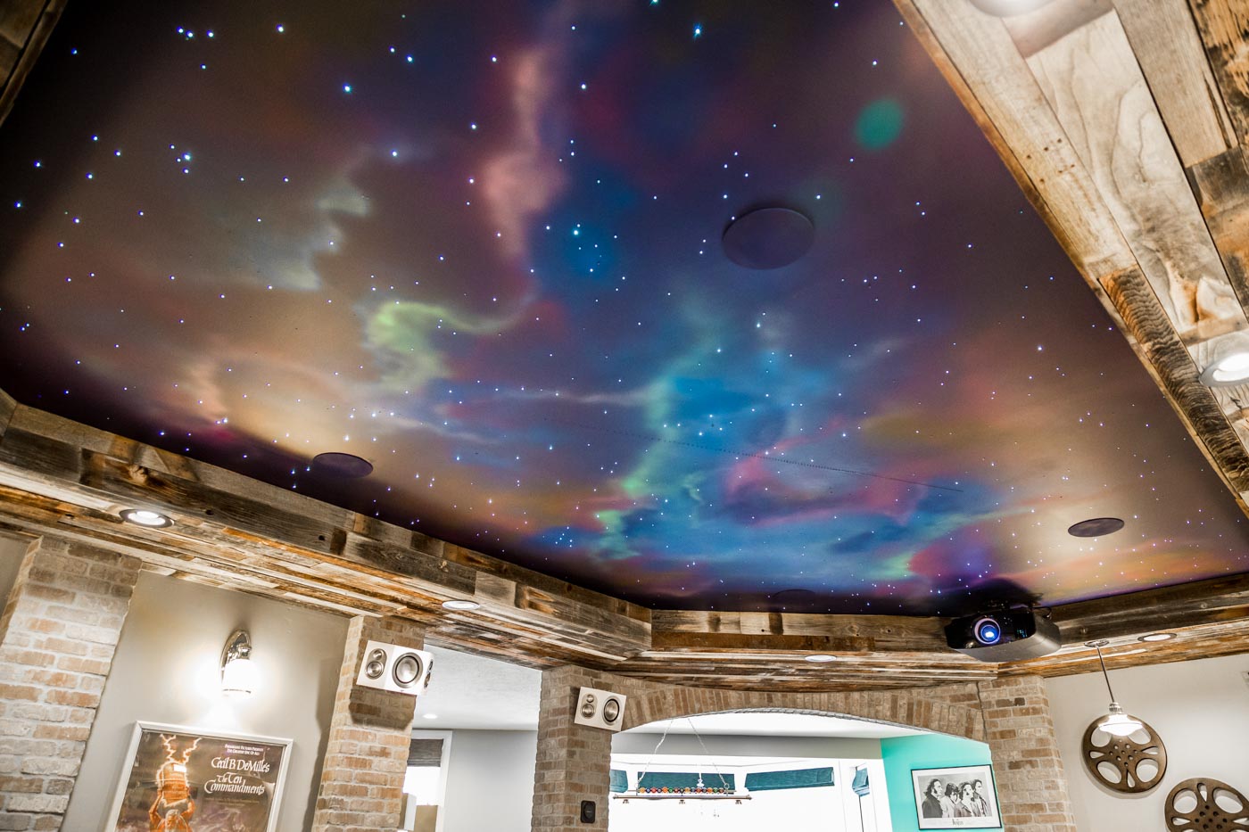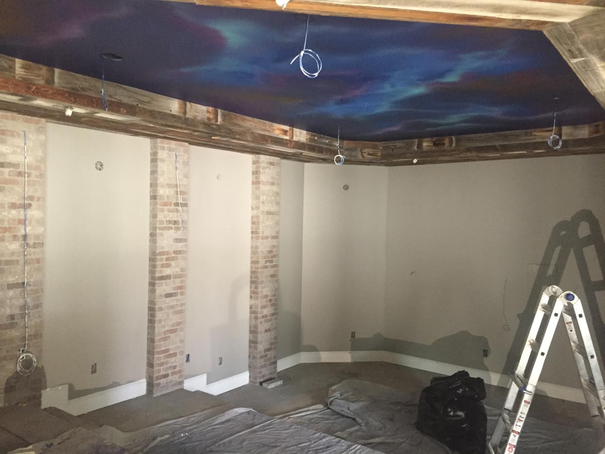The bespoke star ceiling is a TYM specialty. Over 3 miles of fiber optic stands were hand placed into sheetrock during construction. Then TYM’s creative director airbrushed a cosmos mural that comes alive when the light hits it. The completed effect is a show-stopping statement—and it’s where The StarLight Theatre gets its name.